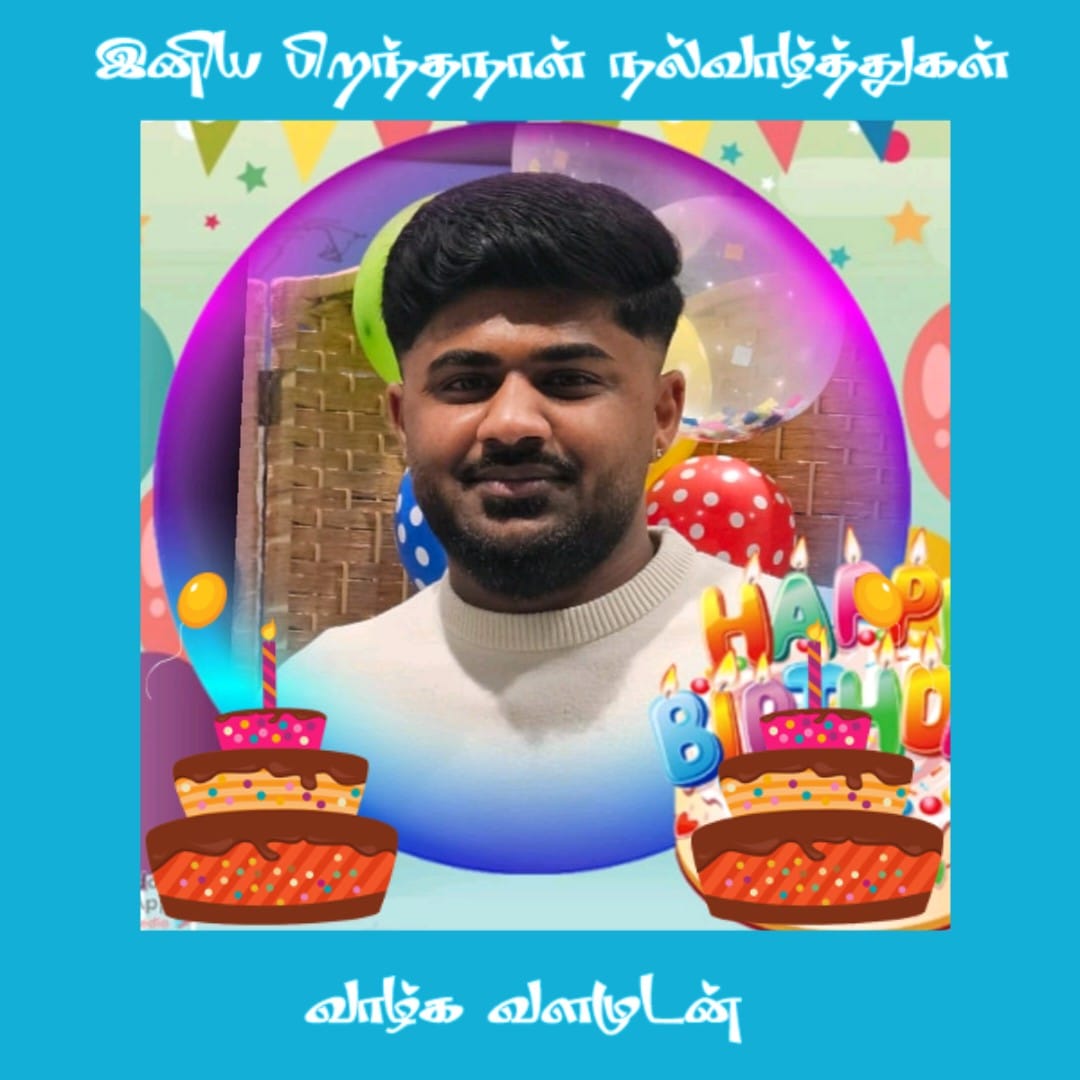 அவரை அவரது அன்புள்ள அப்பா அம்மா அவரது பாசமிகு தங்கை சைந்தவி, தம்பி்மார் , தங்கைமார்கள் மற்றும் அவரது அப்பம்மா(சிறுப்பிட்டி) அம்மாப்பா அம்மம்மா (தெல்லிப்பளை) விக்னேஸ்வரன் மாமா, பானு மாமி (லண்டன்) தணிகை சித்தப்பா கலாசித்தி (லண்டன்) எழில் சித்தப்பா, அருந்தா சித்தி (லண்டன்) , ரமேஸ் சித்தப்பா தர்சினி சித்தி (தெல்லிப்பளை) தம்பிமார் மற்றும் நண்பர்கள் அனைவரும் அவரை பல்லாண்டு காலம் சிறுப்பிட்டி ஞானவைரவர், தெல்லிப்பளை துர்க்கை அம்மன் திருவருள் பெற்று நீடுழி வாழ்கவென வாழ்த்துகின்றனர்